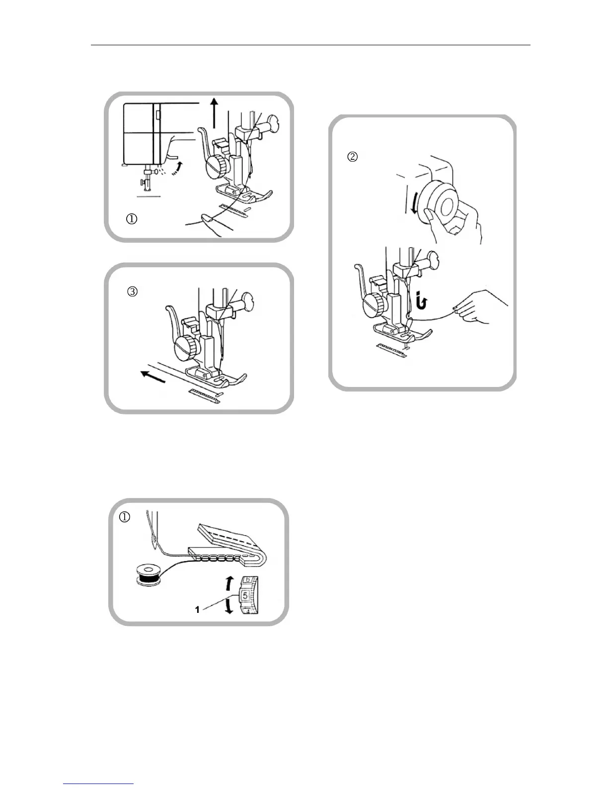 1. Løft trykkfoten og hold lett i overtråden med venstre hånd.