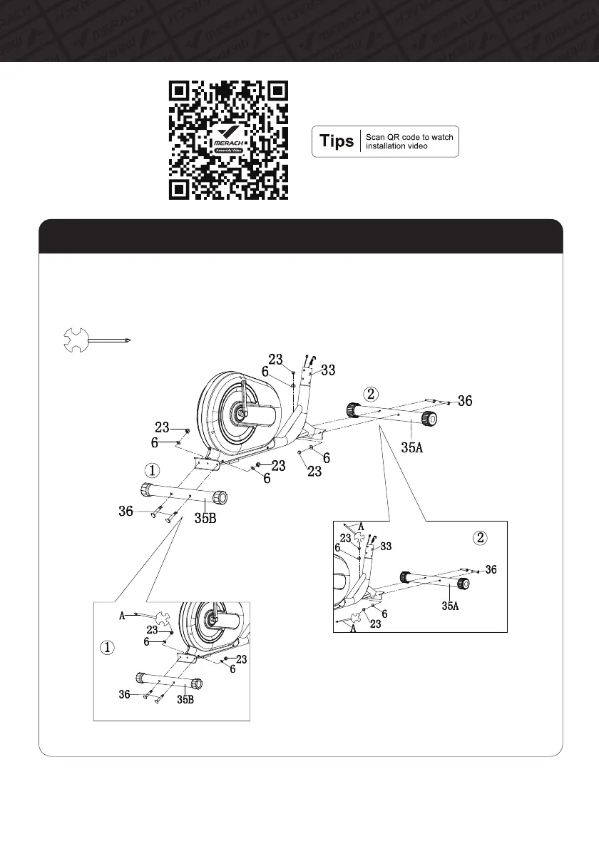 A. Use the Square Neck Bolt(#36), Flat Washer(#6) and Cap Nut(#23) to fix the Front Foot