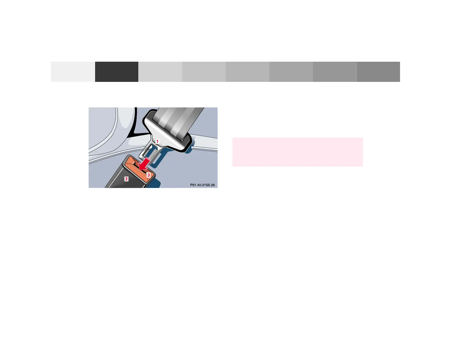 Push latch plate (1) into buckle (2) until it clicks. Do not