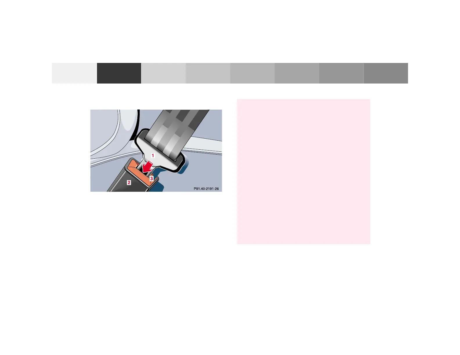 Push the release button (3) in the belt buckle (2).