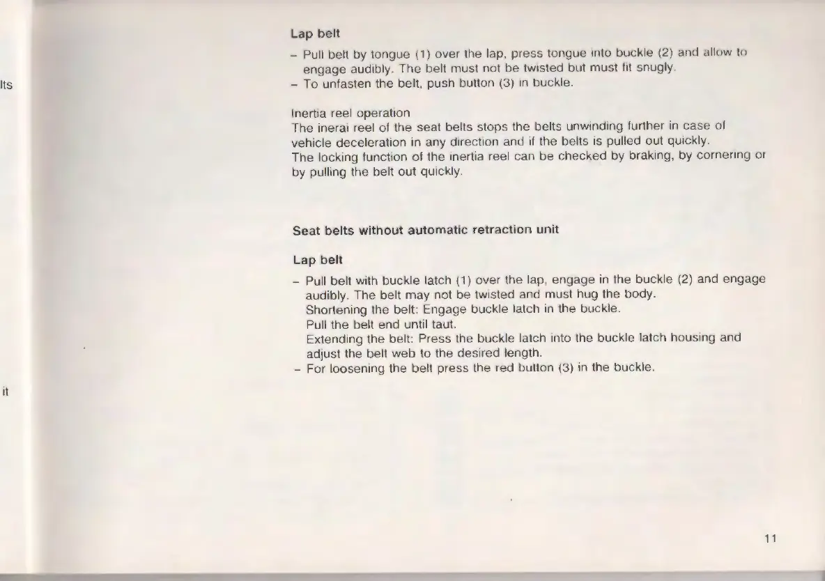 - Pull belt by tongue ( 1) over the lap, press tongue into buckle (2) and allow to