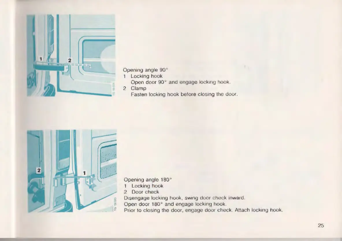 Prior to closing the door, engage door check. Attach lock ing hook.