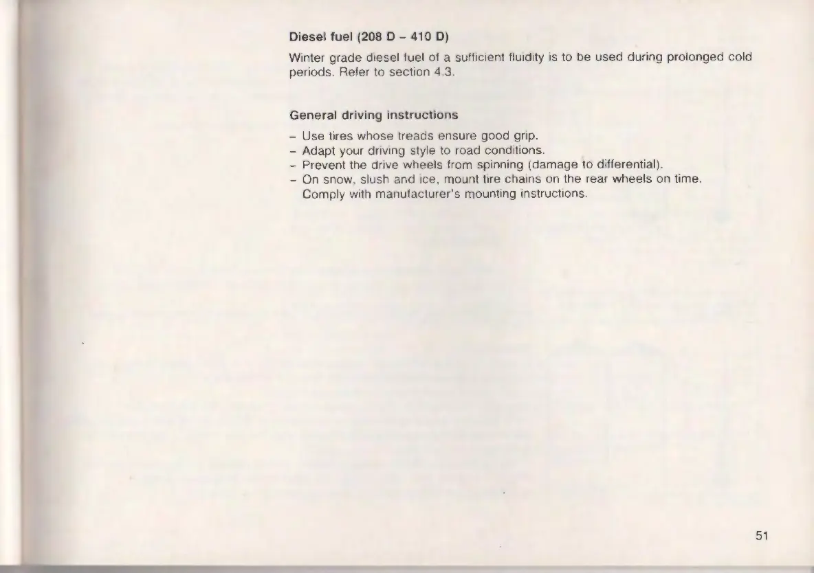 - On snow, slush and ice, mount tire chains on the rear wheels on time.