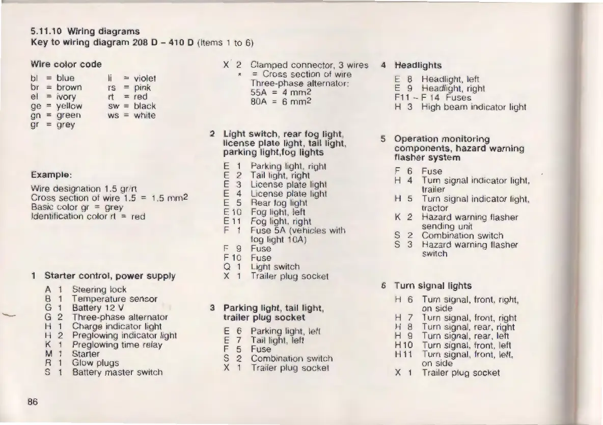 Key to wiring diagram 208 D - 410 D (Items 1 to 6)