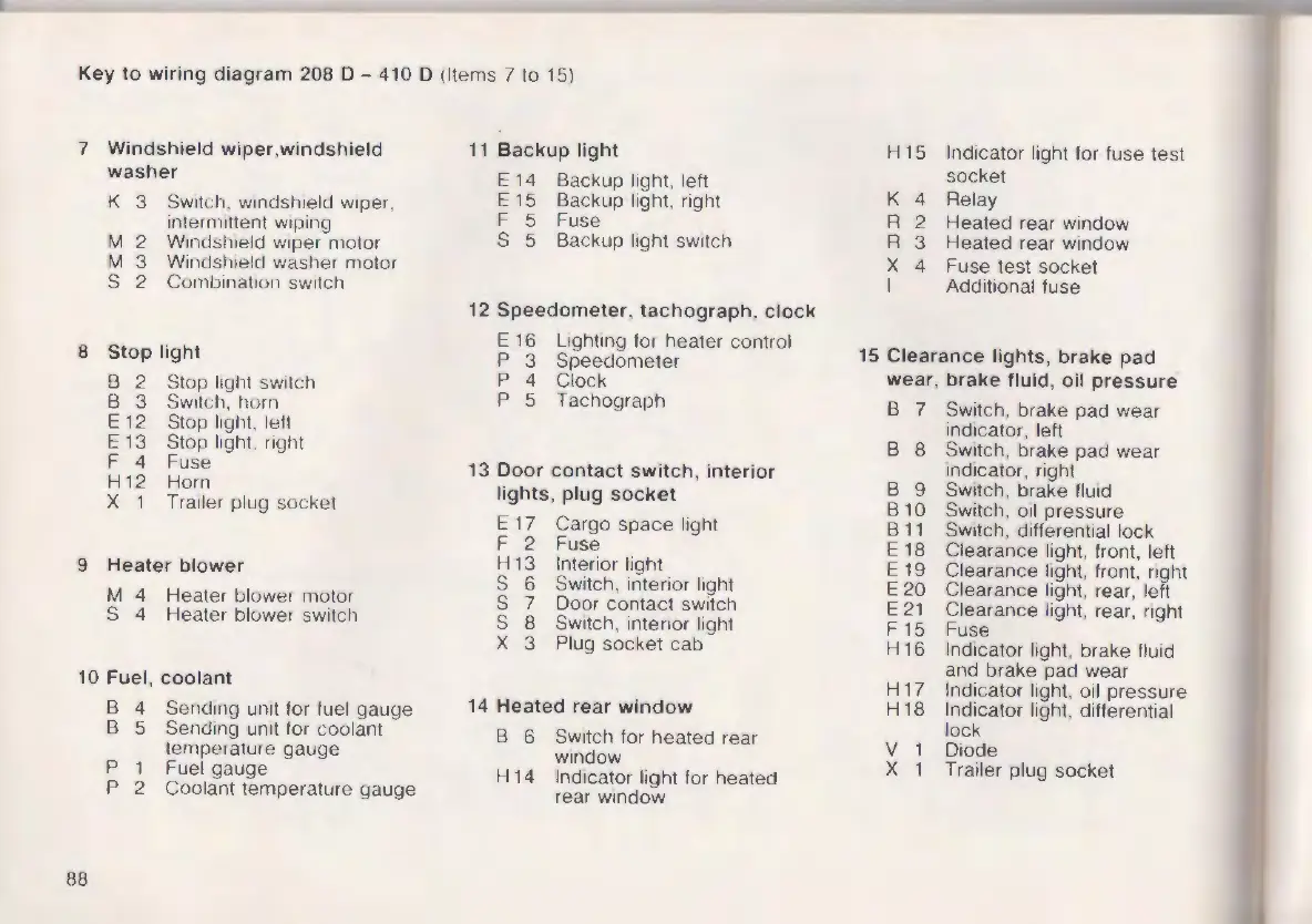 Key to wiring diagram 208 D - 410 D (Items 7 to 15)