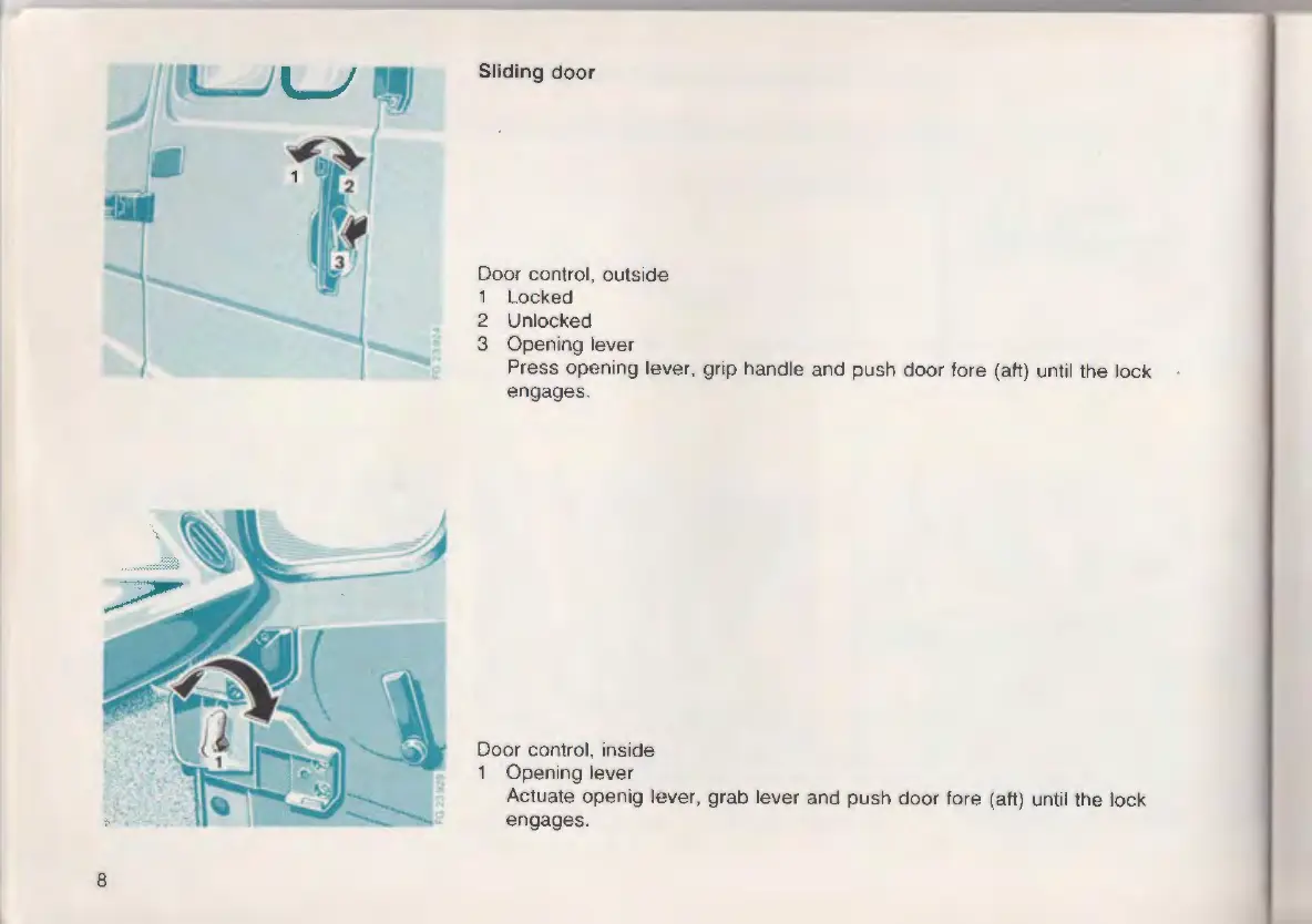 Actuate openig lever , grab lever and push door fore (aft) until the lock