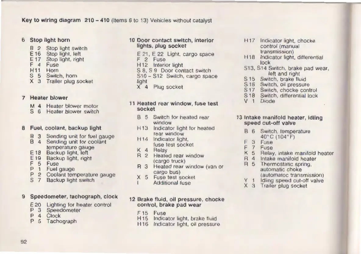Key to wiring diagram 210 - 410 (Items 6 to 13) Vehicles without catalyst