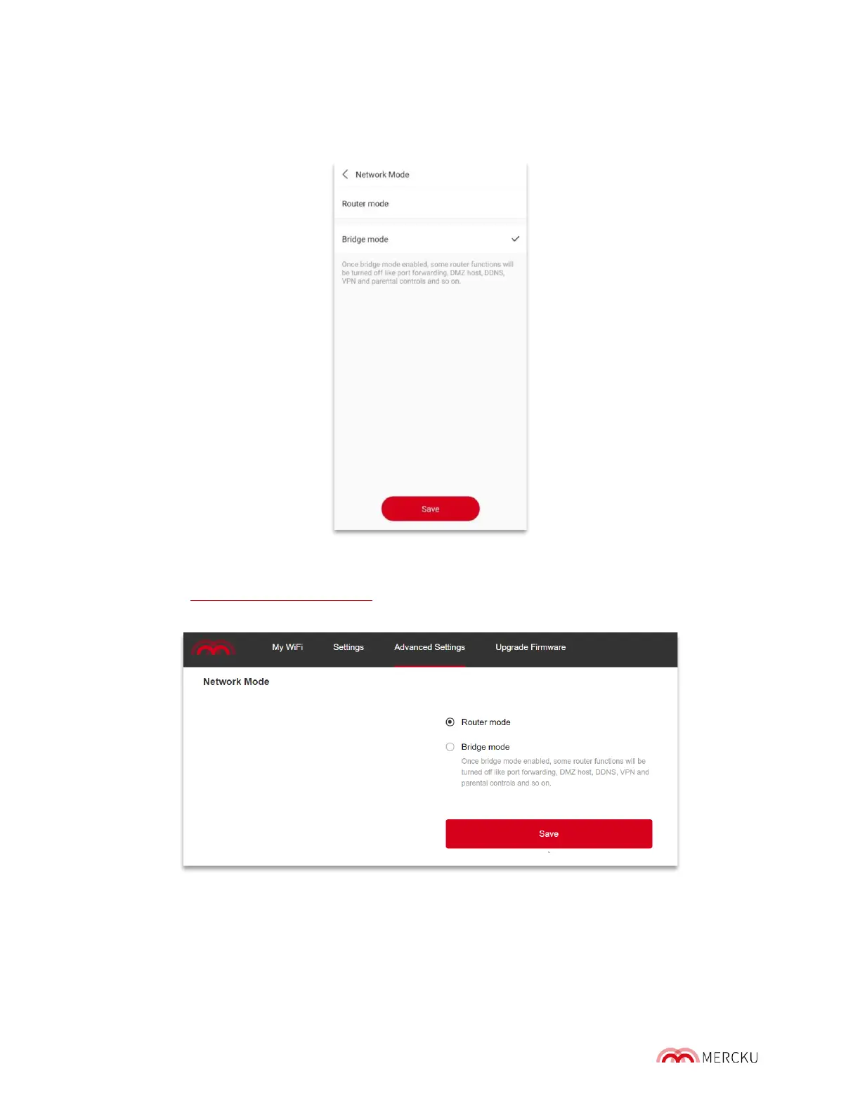 2. Settings > Network Settings > Network Mode > Bridge Mode > Save