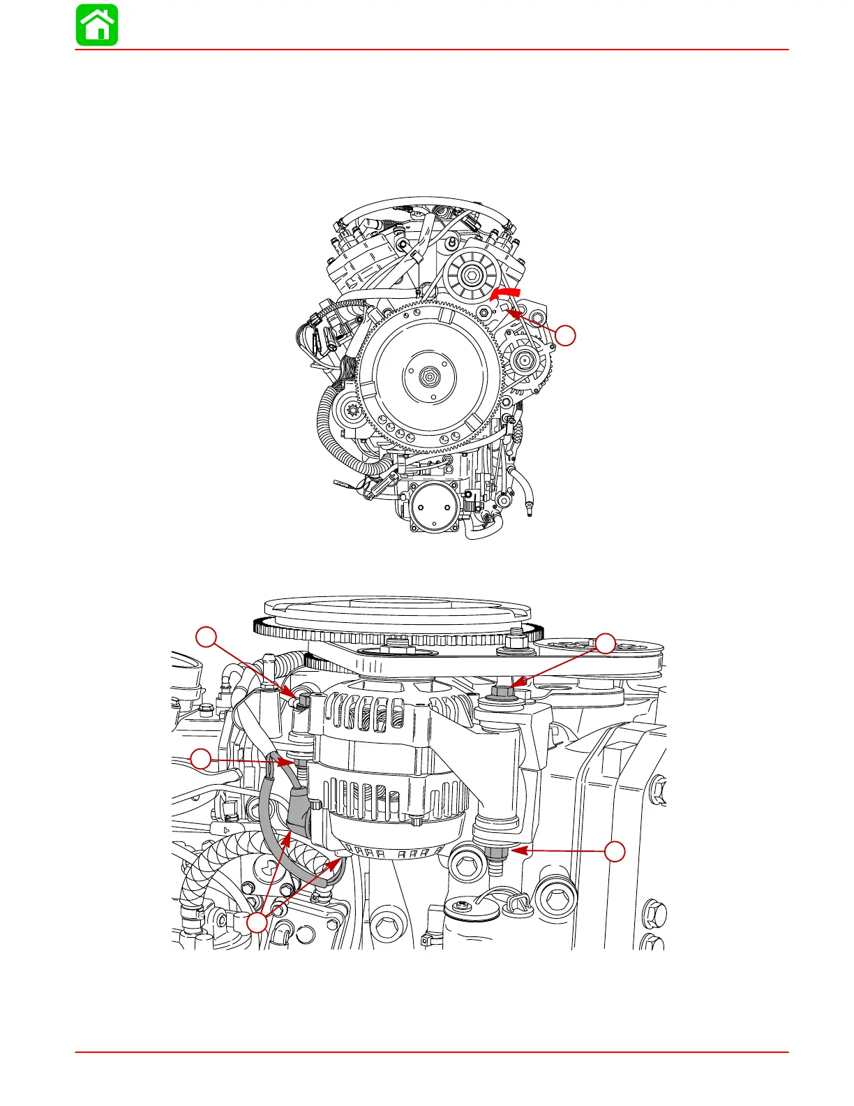 1. Secure alternator to engine block with attaching bolts. Torque top bolt to 40 lb-ft (54