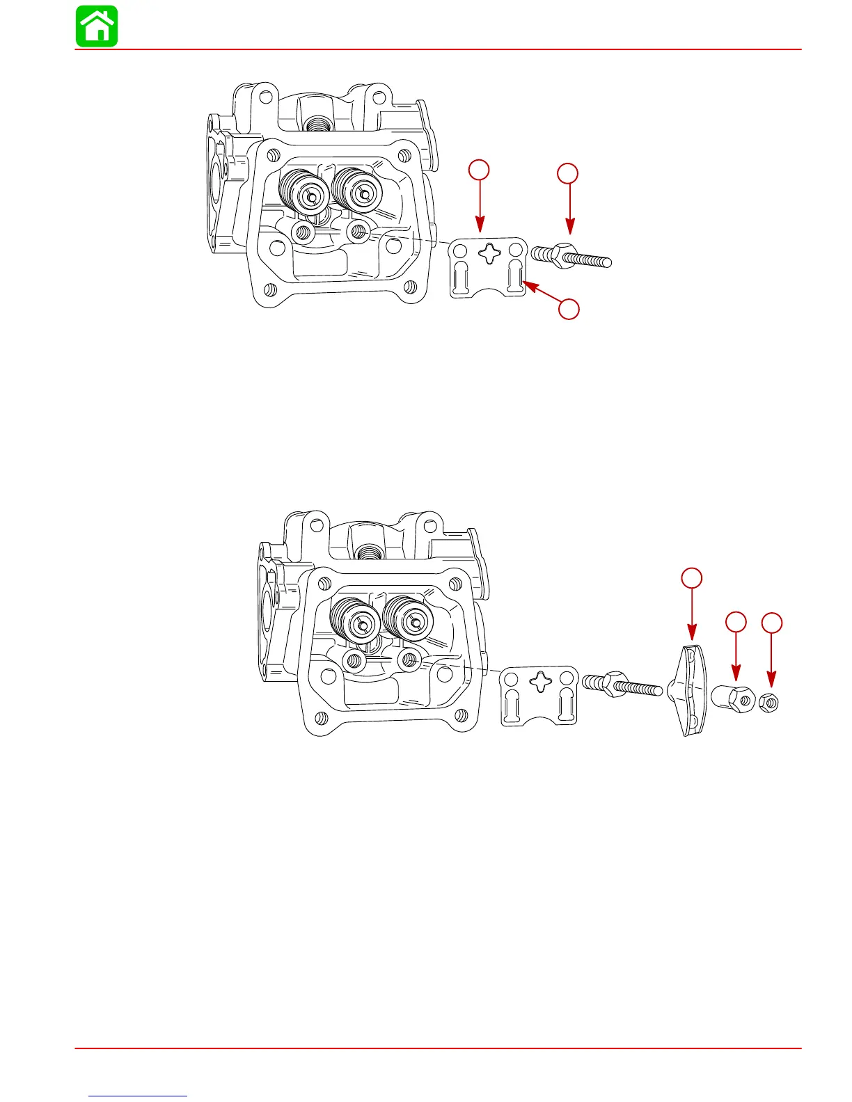 3. Install rocker arm plate and 2 pivot bolts. Torque pivot bolts to 18 lb-ft (24.4 Nm).