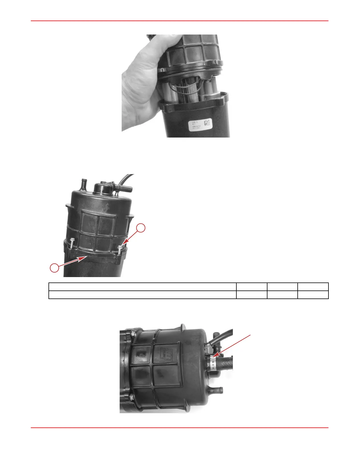 32. Install a 16.2 mm metal hose clamp onto the high‑pressure hose and install the hose onto the FSM upper housing. Use the