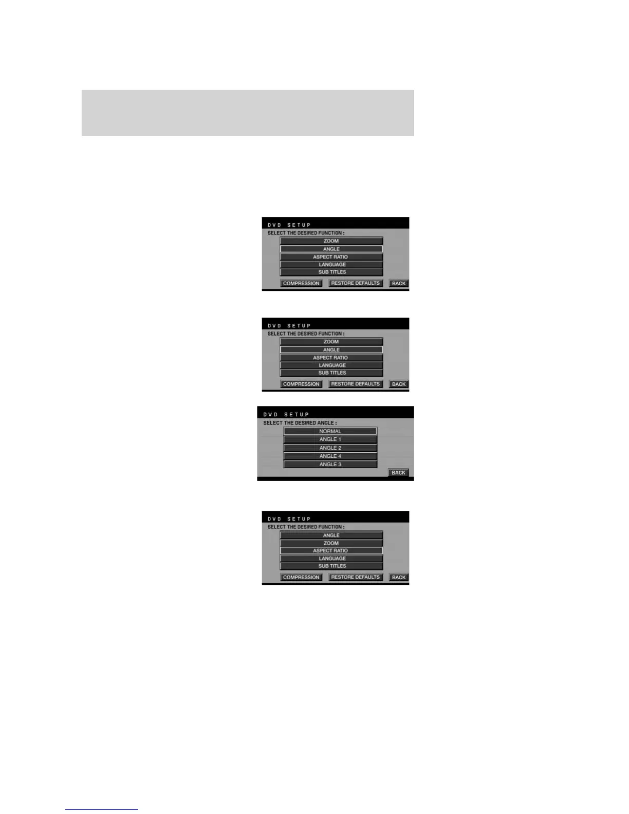 Press MENU twice to access the DVD set-up menu and the following