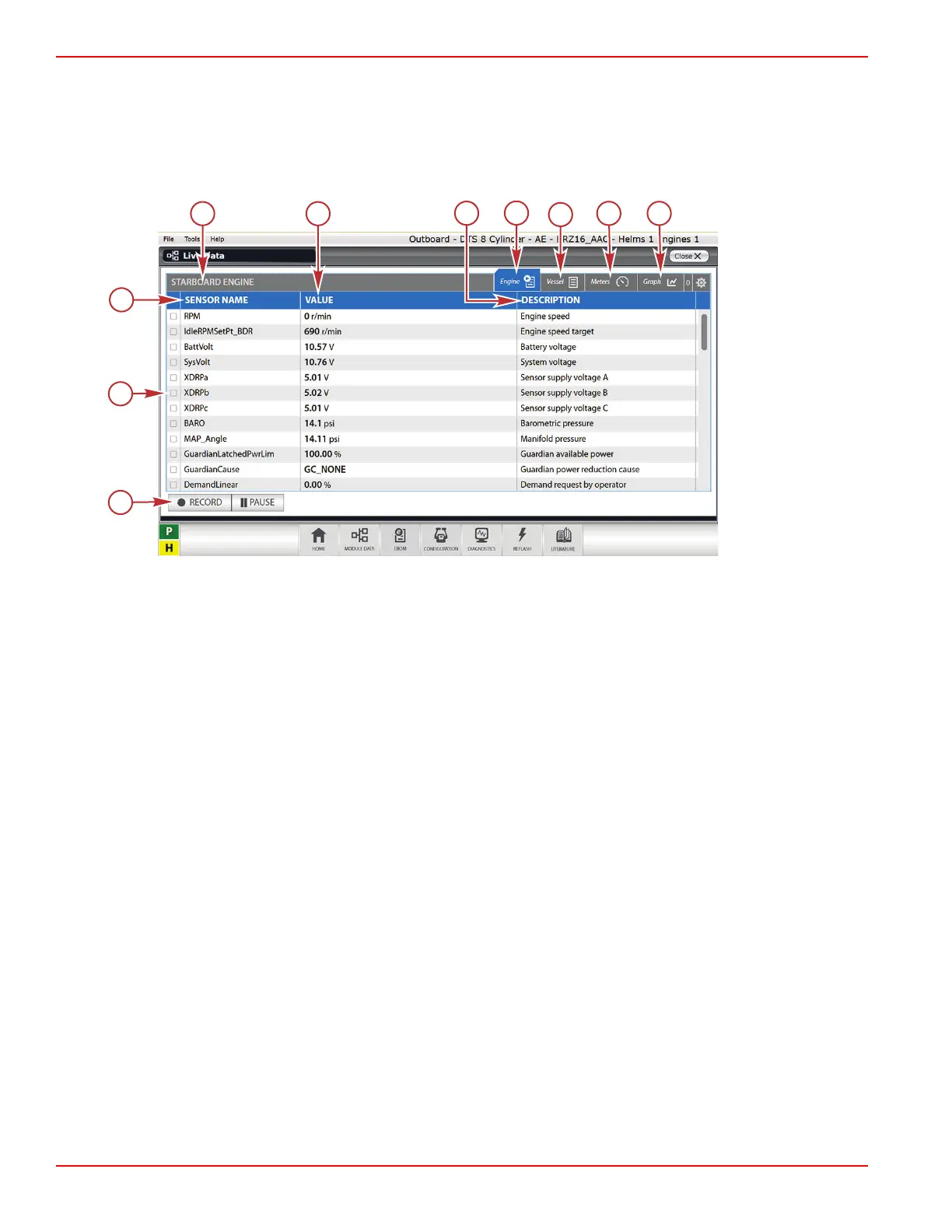 The following table explains the line entries on the Live Data screen. Note that some entries appear on the Engine (Eng.) tab,