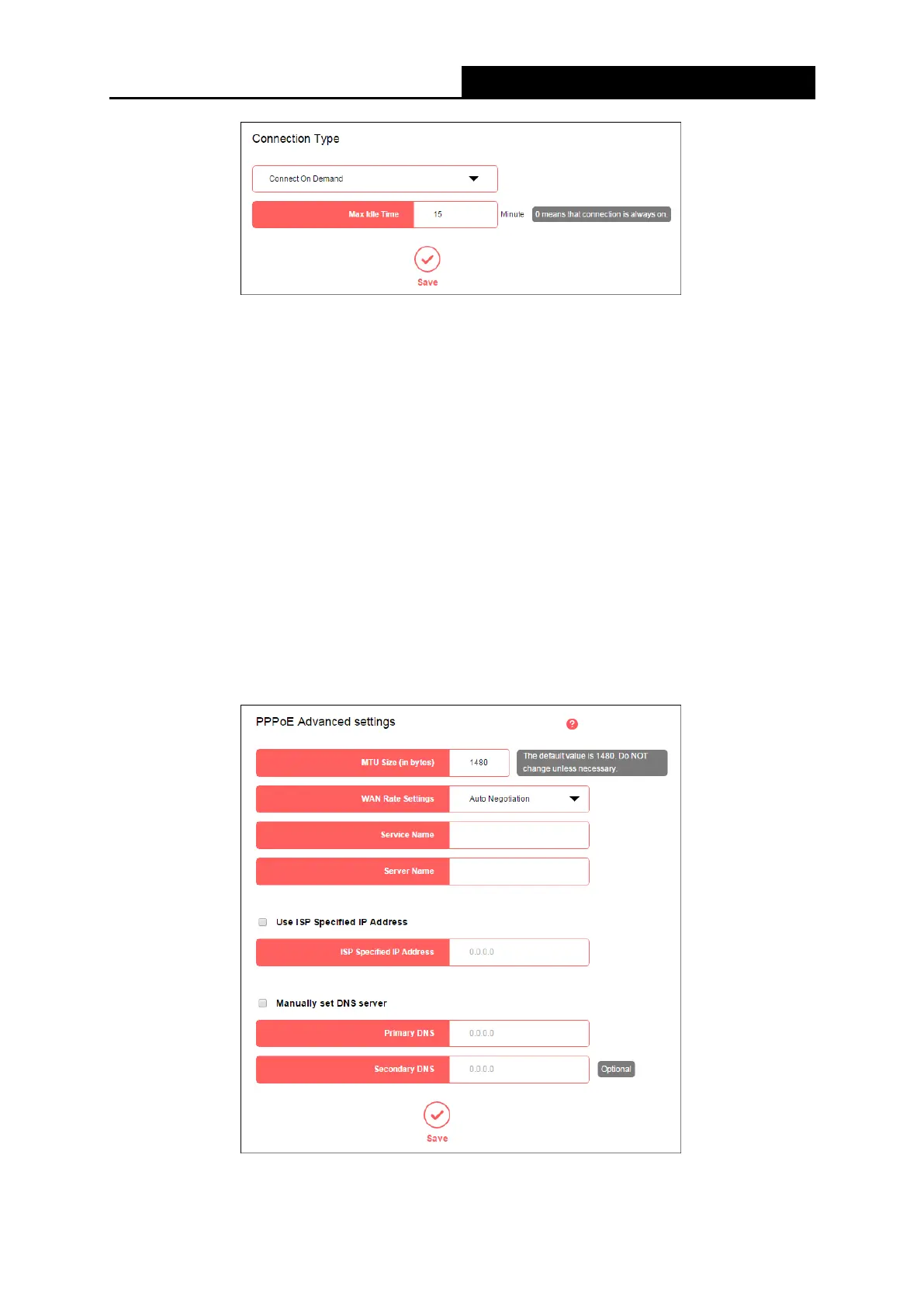 • Connect On Demand - In this mode, the Internet connection can be terminated