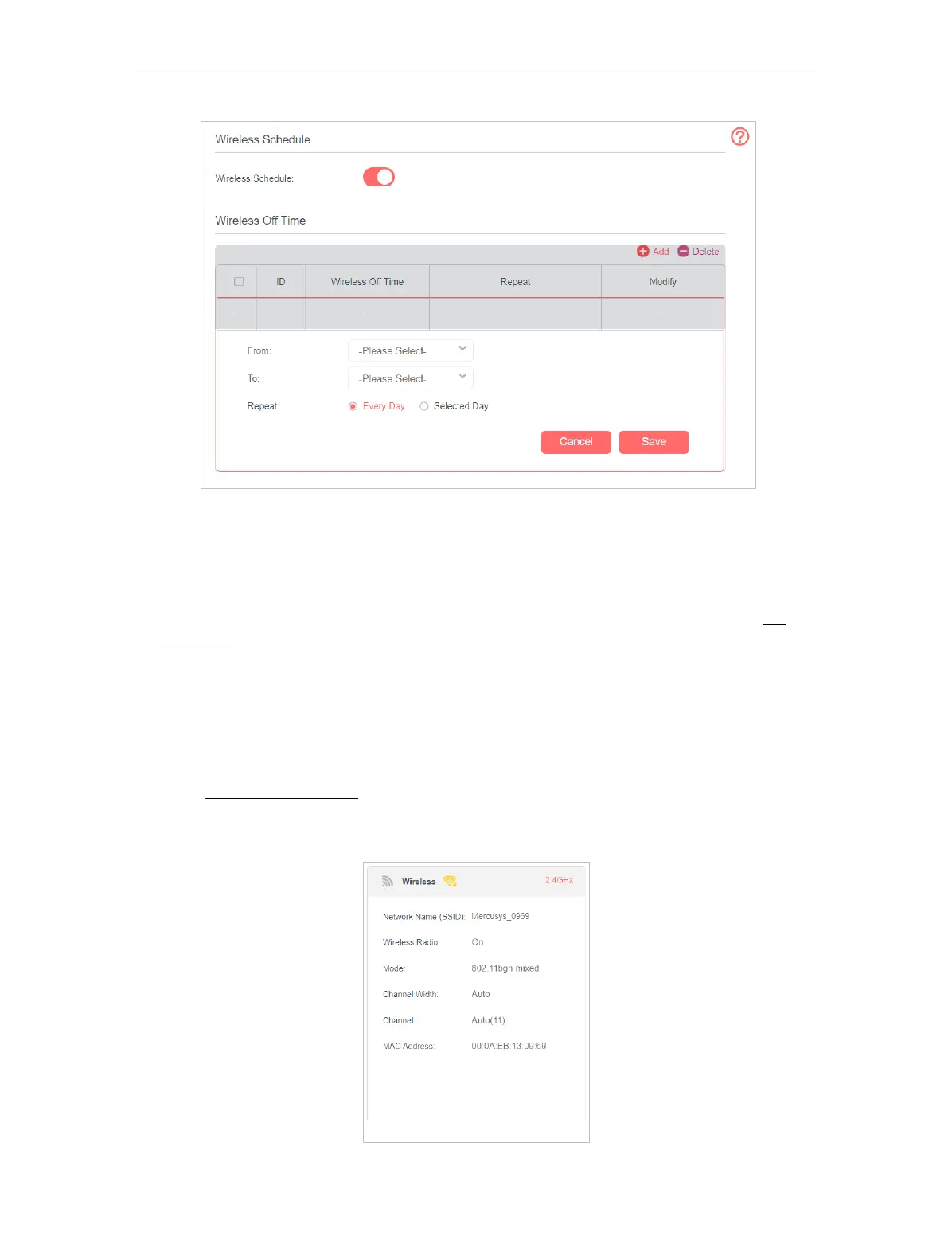 4. Set the wireless off time. Select From and To time. You can repeat the schedule