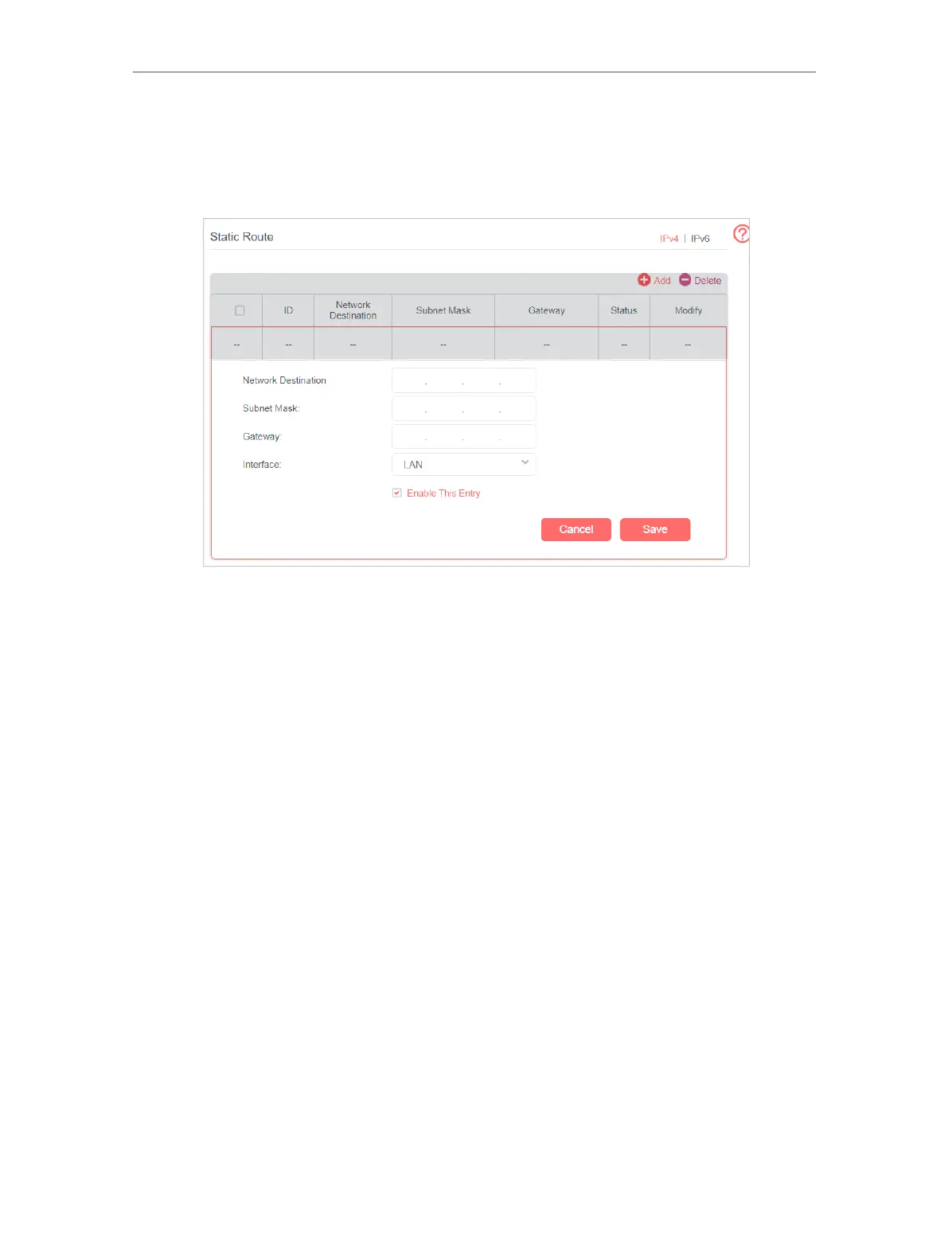 4. Click Add to add a new static routing entry. Finish the settings according to the