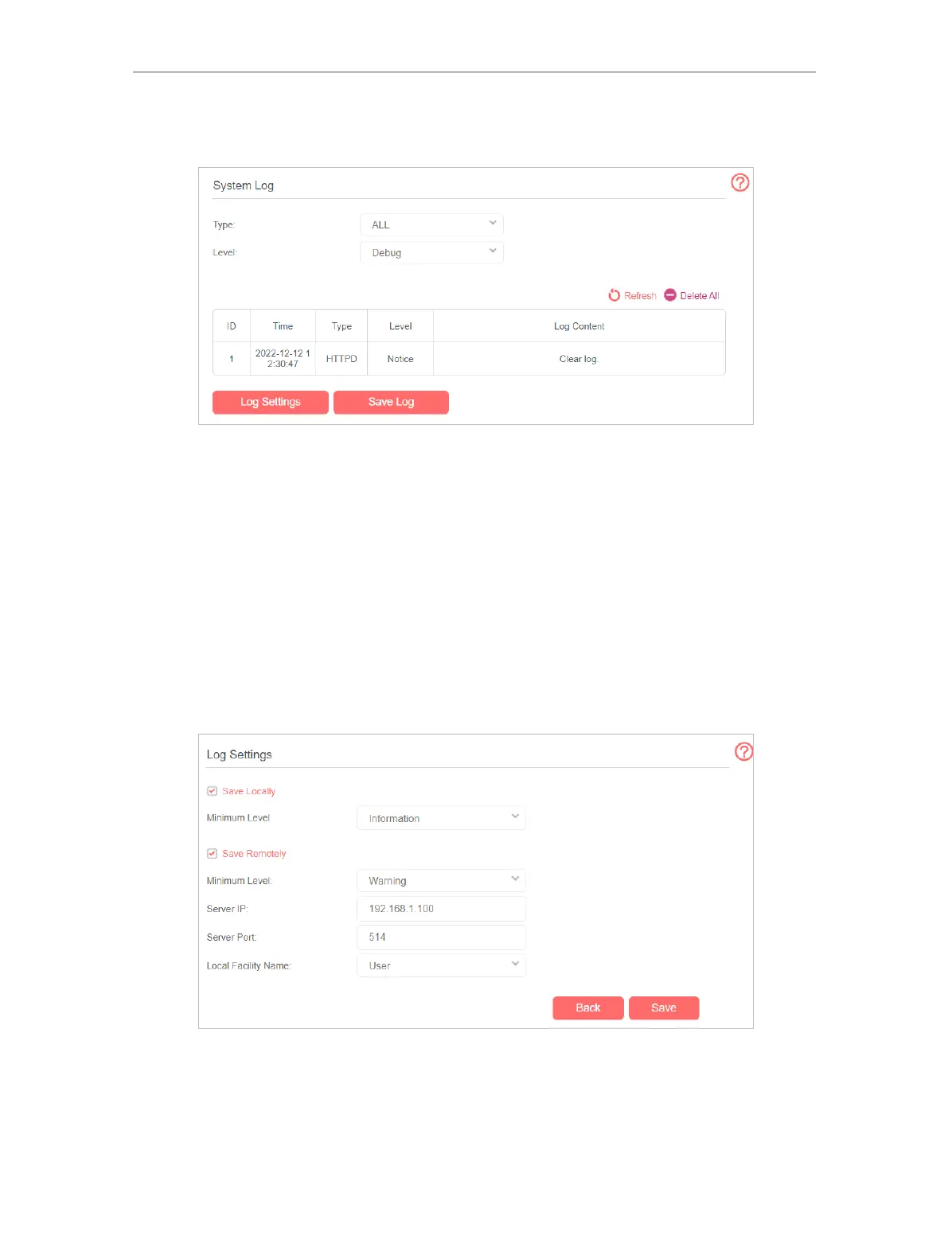 You can choose to save the system logs to your local computer or a remote server.
