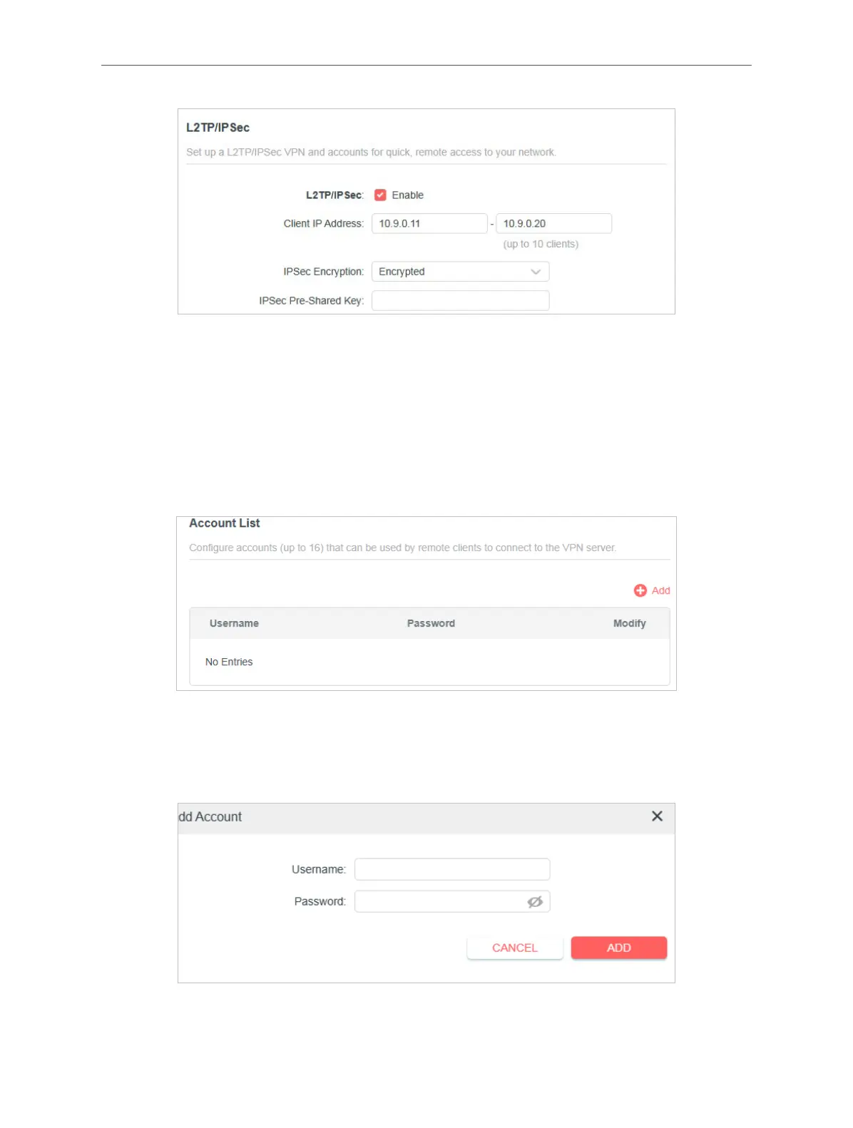 6. Congure the L2TP/IPSec VPN connection account for the remote device. You can
