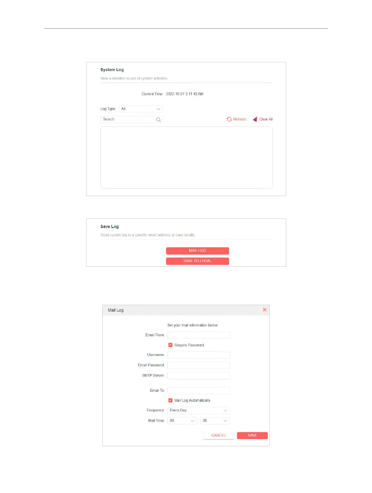 4. If you want to send the system log to your mailbox, click MAIL LOG and configure the mail