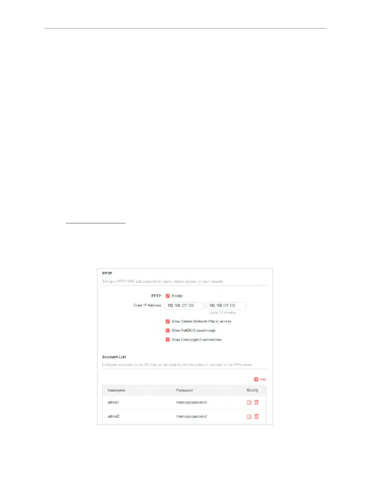 To use the VPN feature, you should enable PPTP VPN Server on your router, and configure