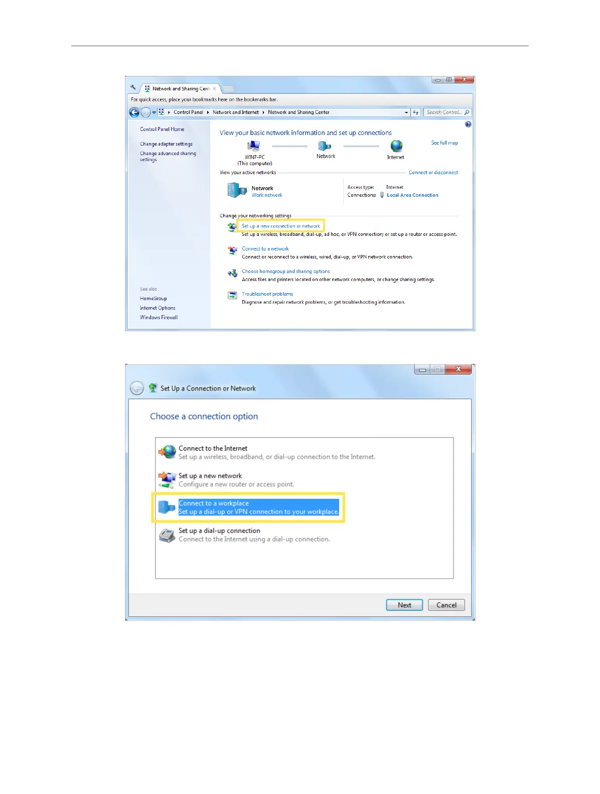 3. Select Connect to a workplace and click Next.