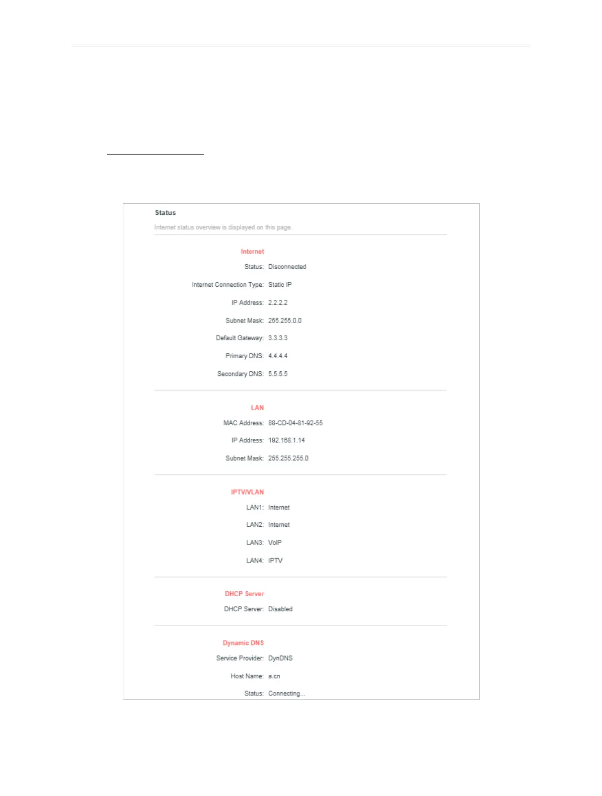 2. Go to Advanced > Network > Status. You can view the current status information of the
