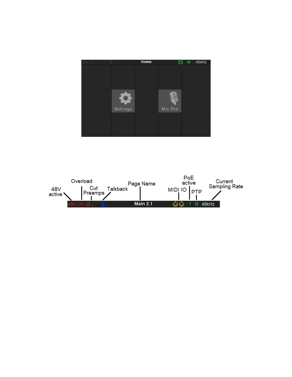 48V: Will light up red if 48 Phantom power is active on an input channel