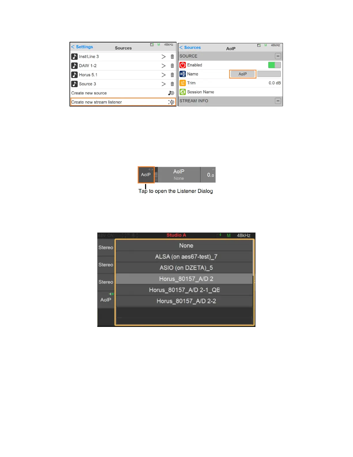Settings>Source. By factory one AoIP source listener should already be available.