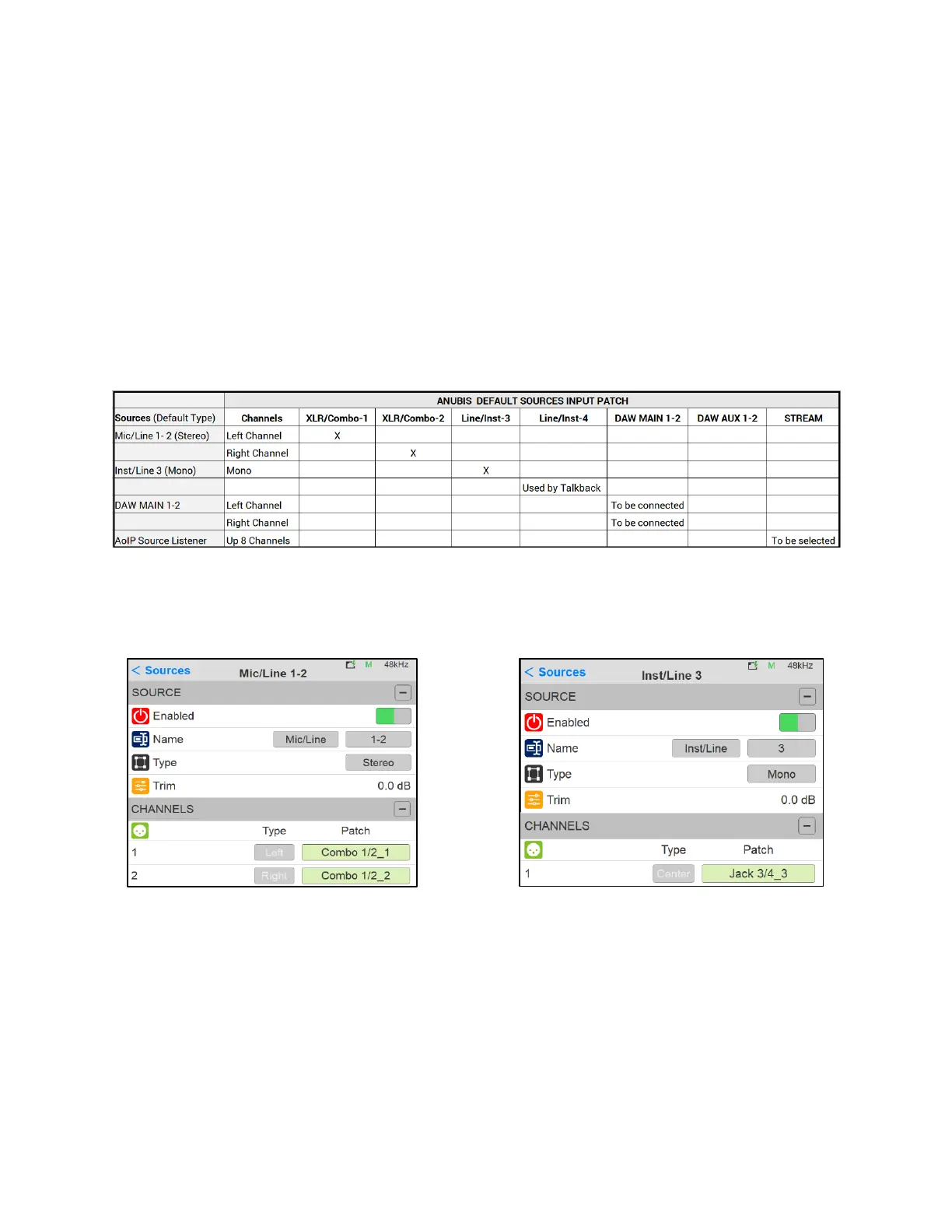 The Anubis default factory settings come with a MIC/Line 1-2 Source and Inst/Line 3 Source. If