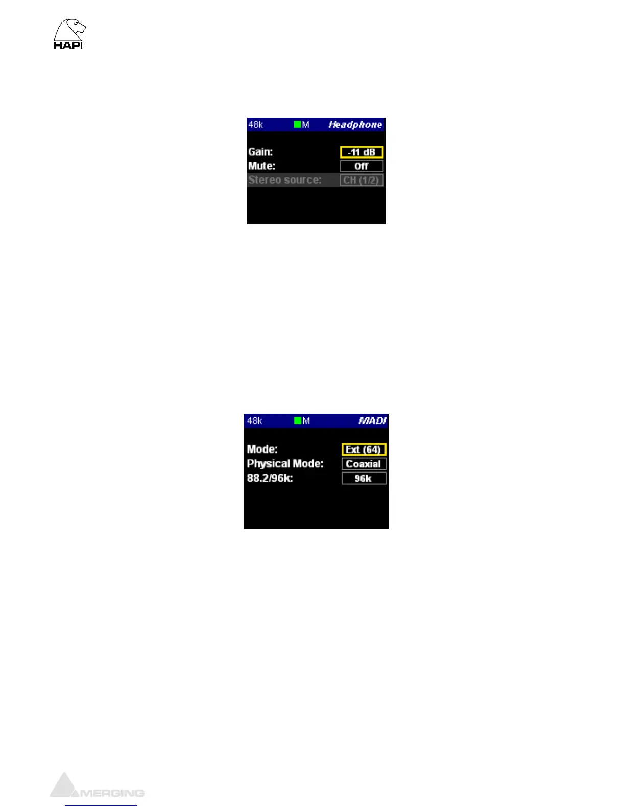 The Headphone menu refers to the Hapi front panel Headphone Monitor jacks. The Headphone jacks 1