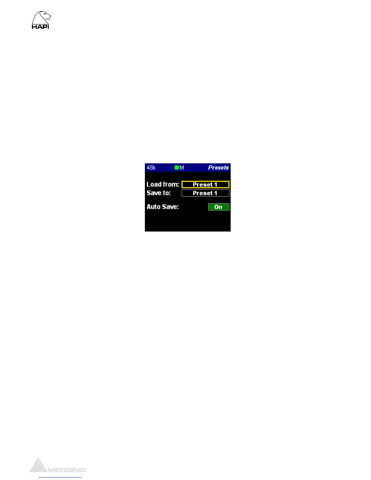 Load: 5 presets banks of different Hapi configurations can be loaded (one at a time)