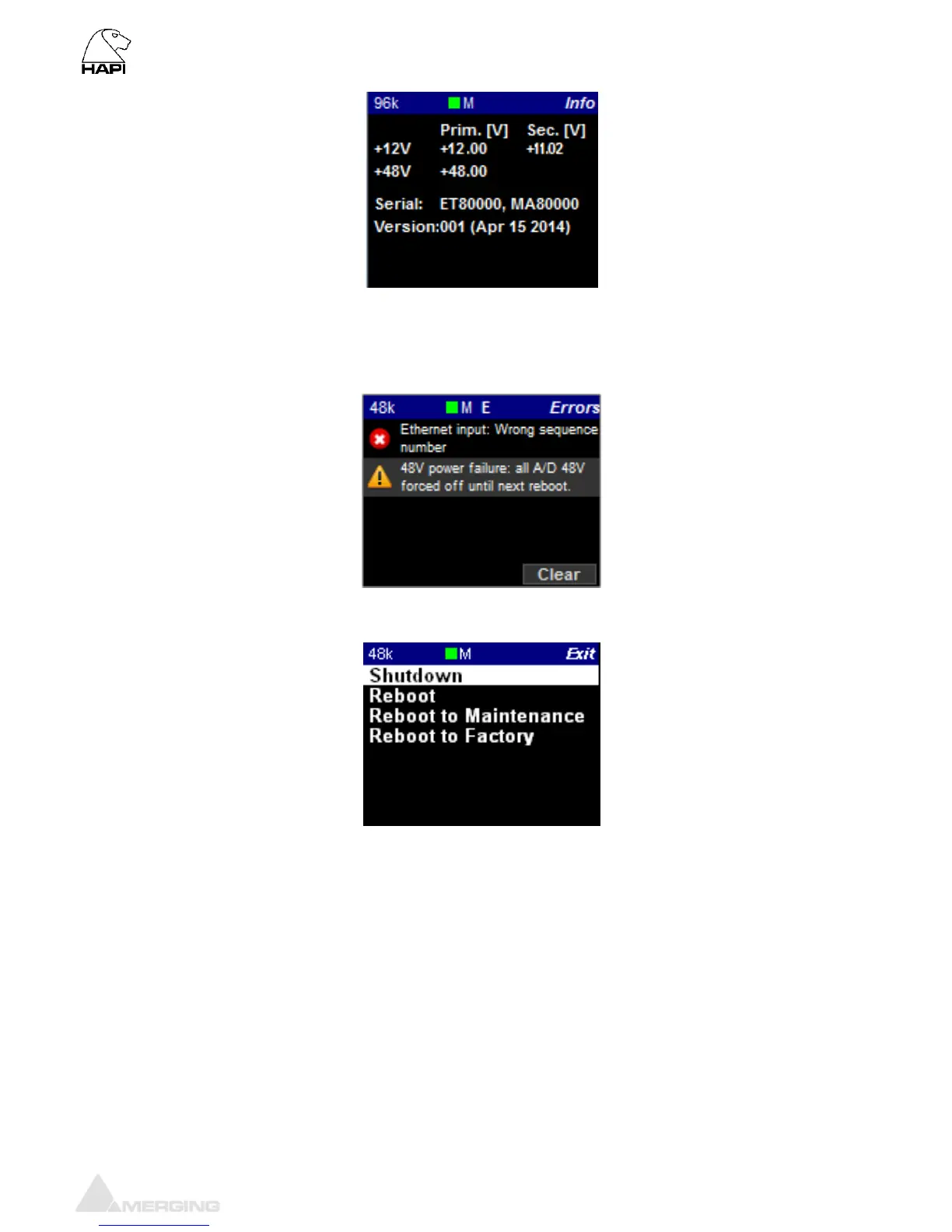 Reboot: Power cycles the Hapi unit (shutdown>Boot up)