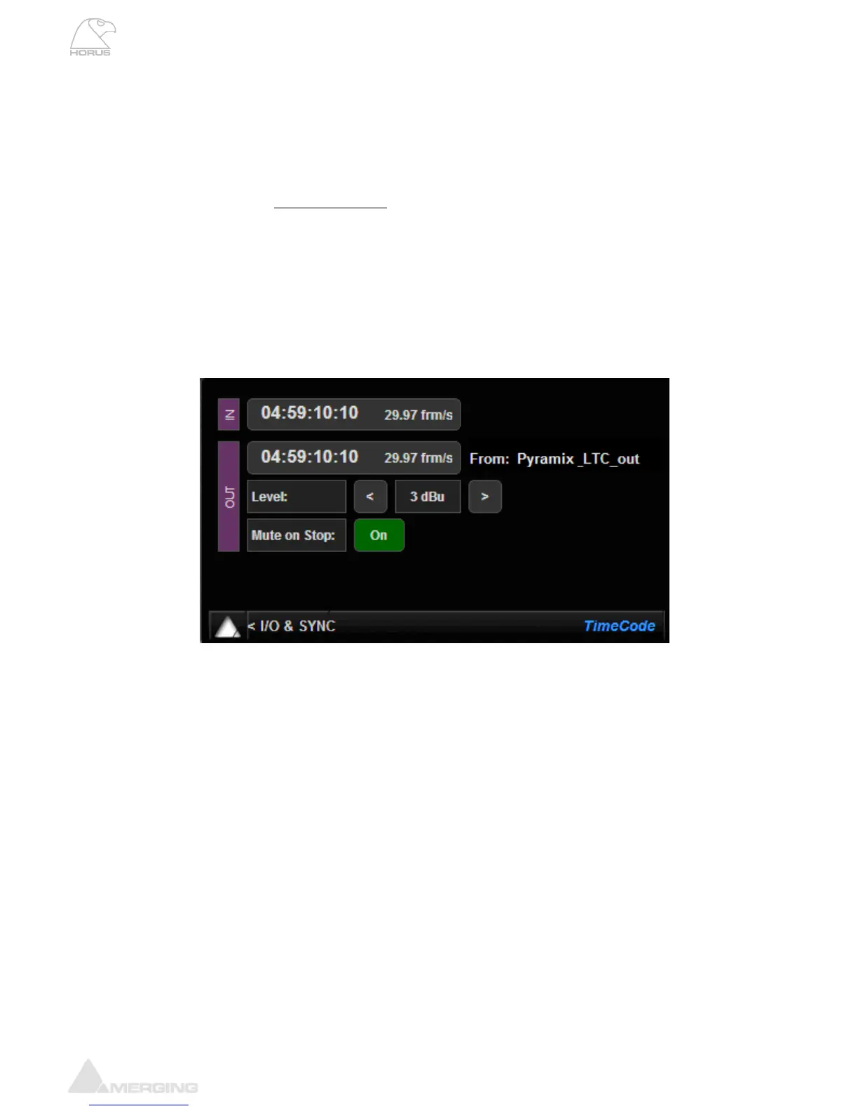 Frame Rate: The current LTC/Timecode Frame Rate is indicated next to the Timecode IN &