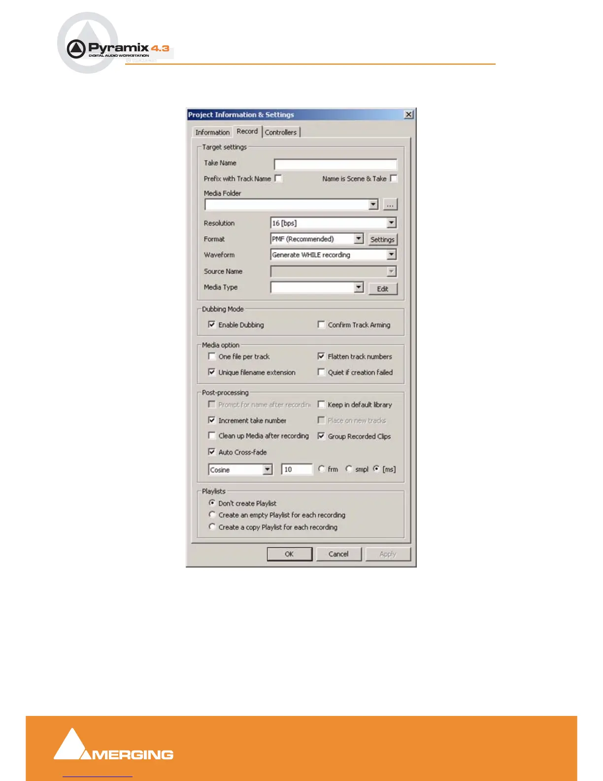 Project Inf or ma ti on & Set tings dialo g b ox - Reco r d Ta b p age