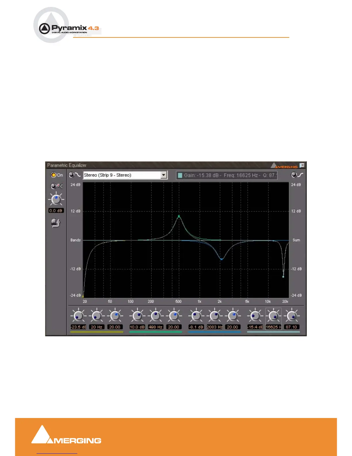 All bands are full range. Boost and cut of up to 24dB is available. Q can be set anywhere from 0.2