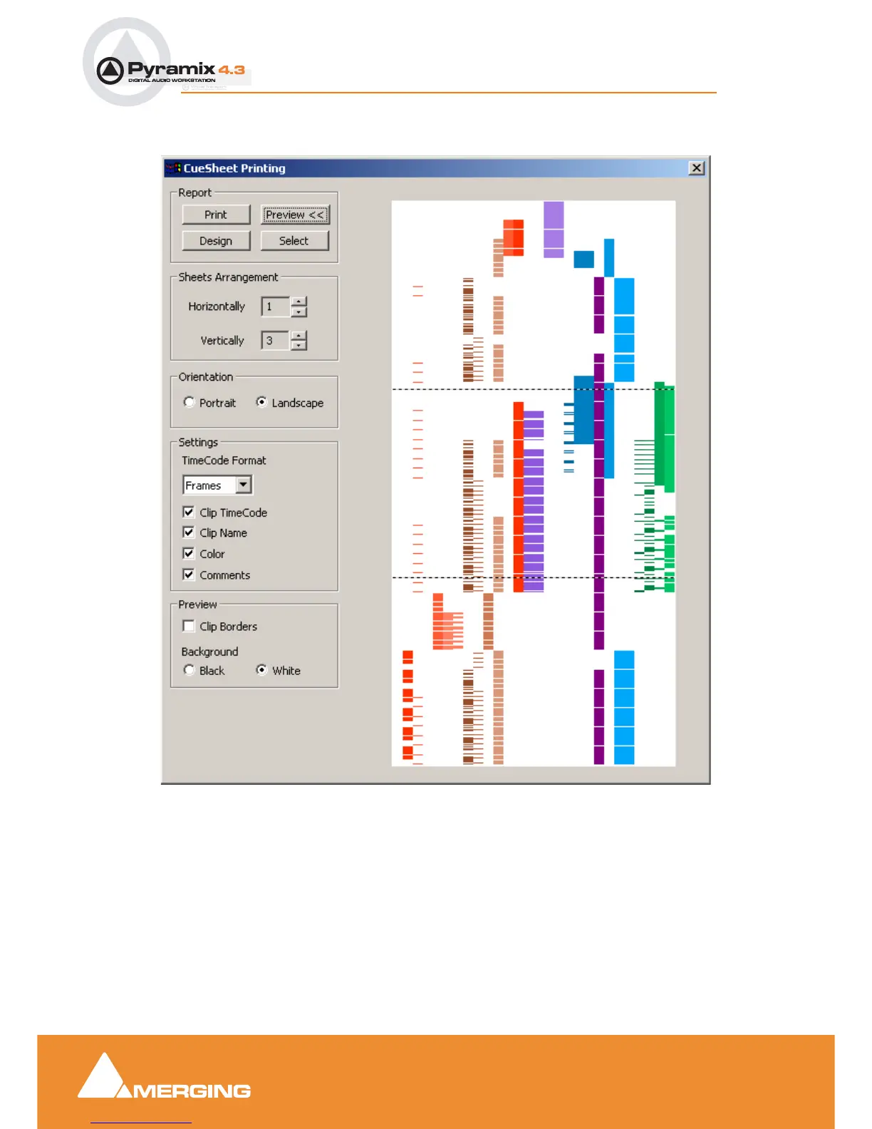 The CueSheet Printing window opens. (Shown with the Preview option selected.):