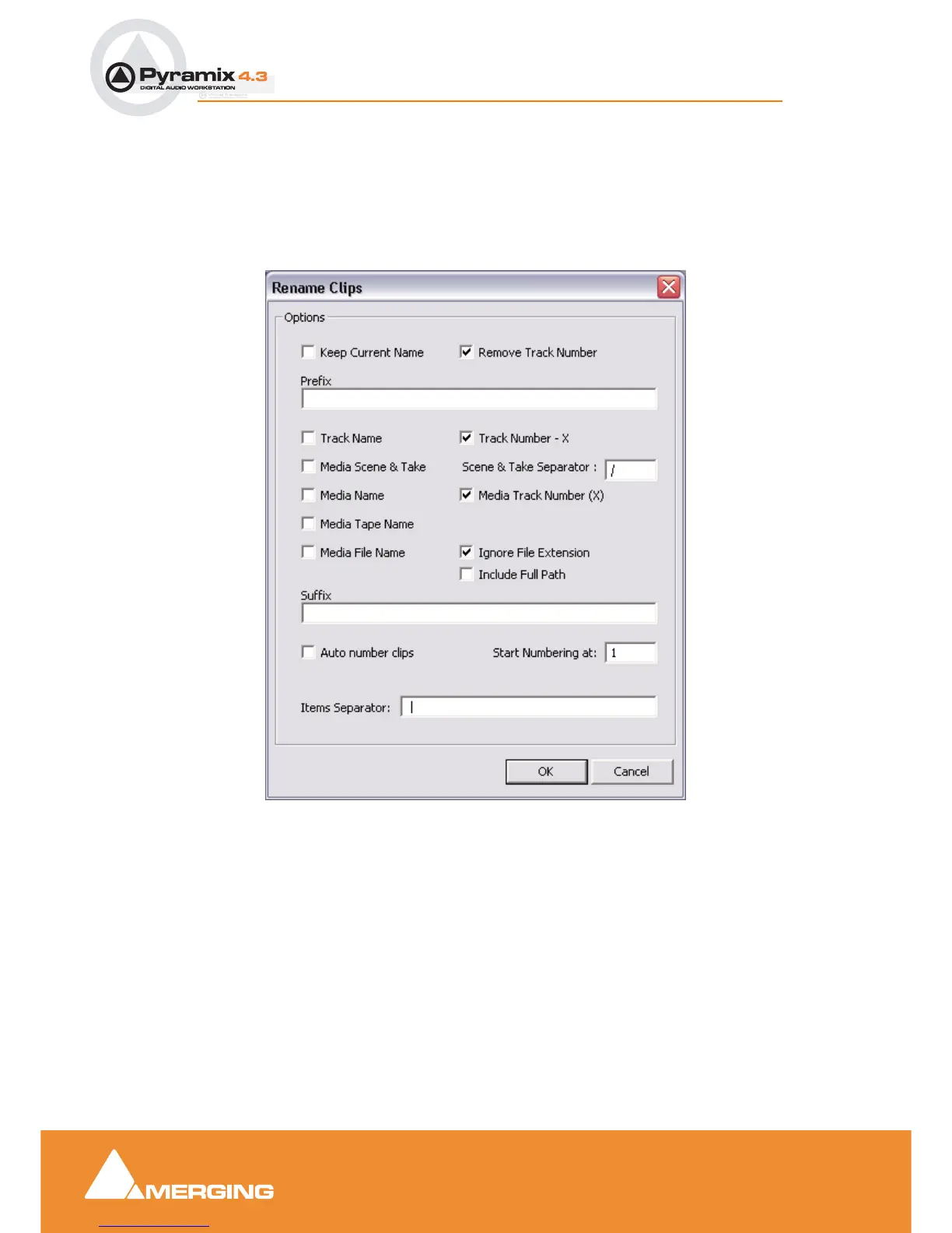 Rename Enables a selection of clips to be renamed with various combinable options chosen