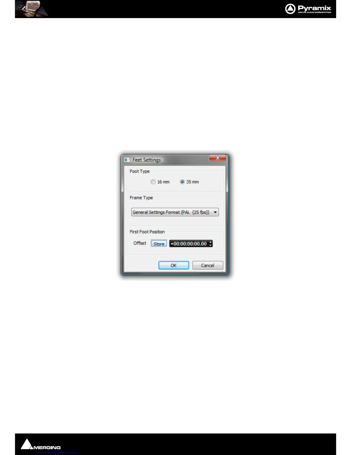 The radio buttons offer a choice of 16mm feet (units of 40 frames) and 35mm feet (units of 16 frames).