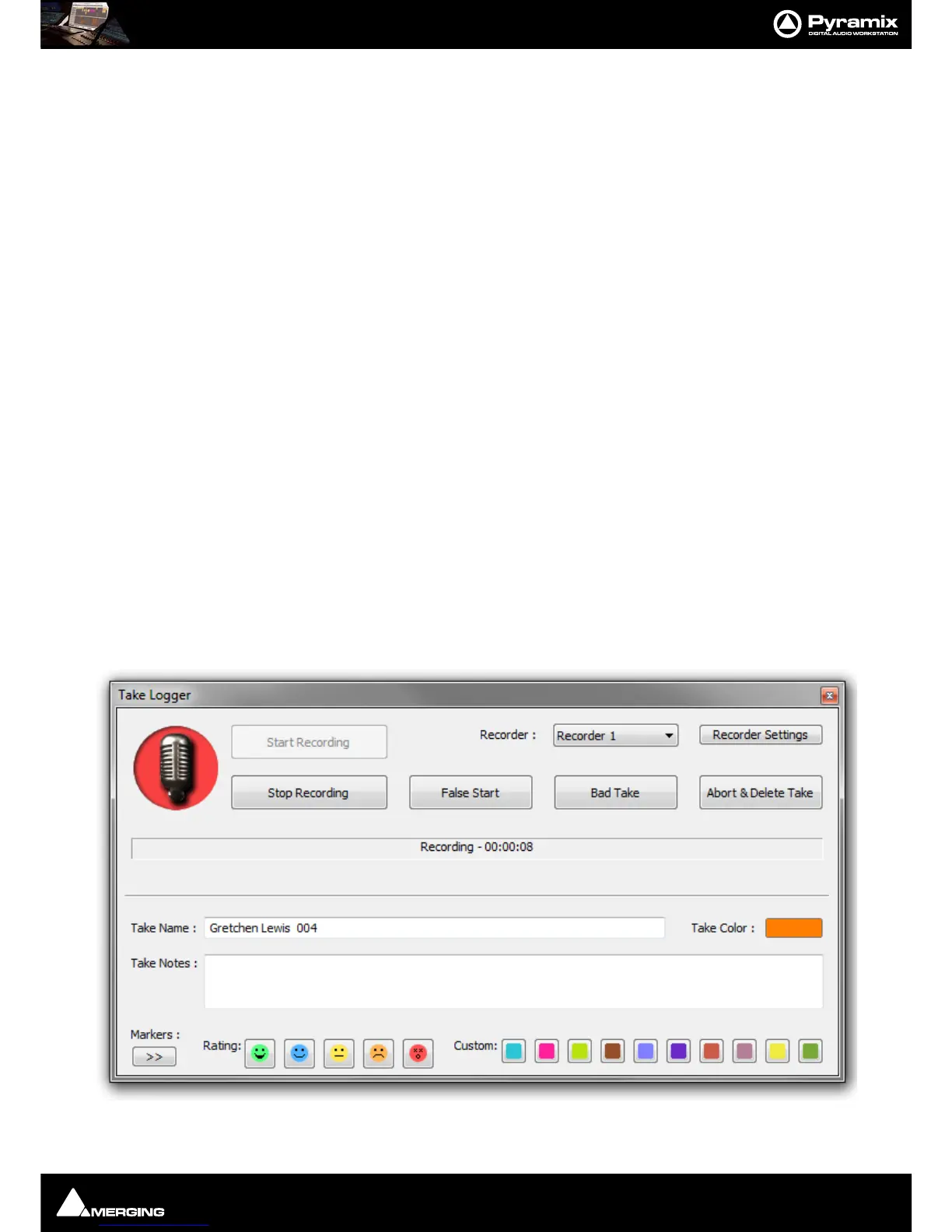 The Status Field shows information about the current state of the recorder being controlled by the Take Logger.