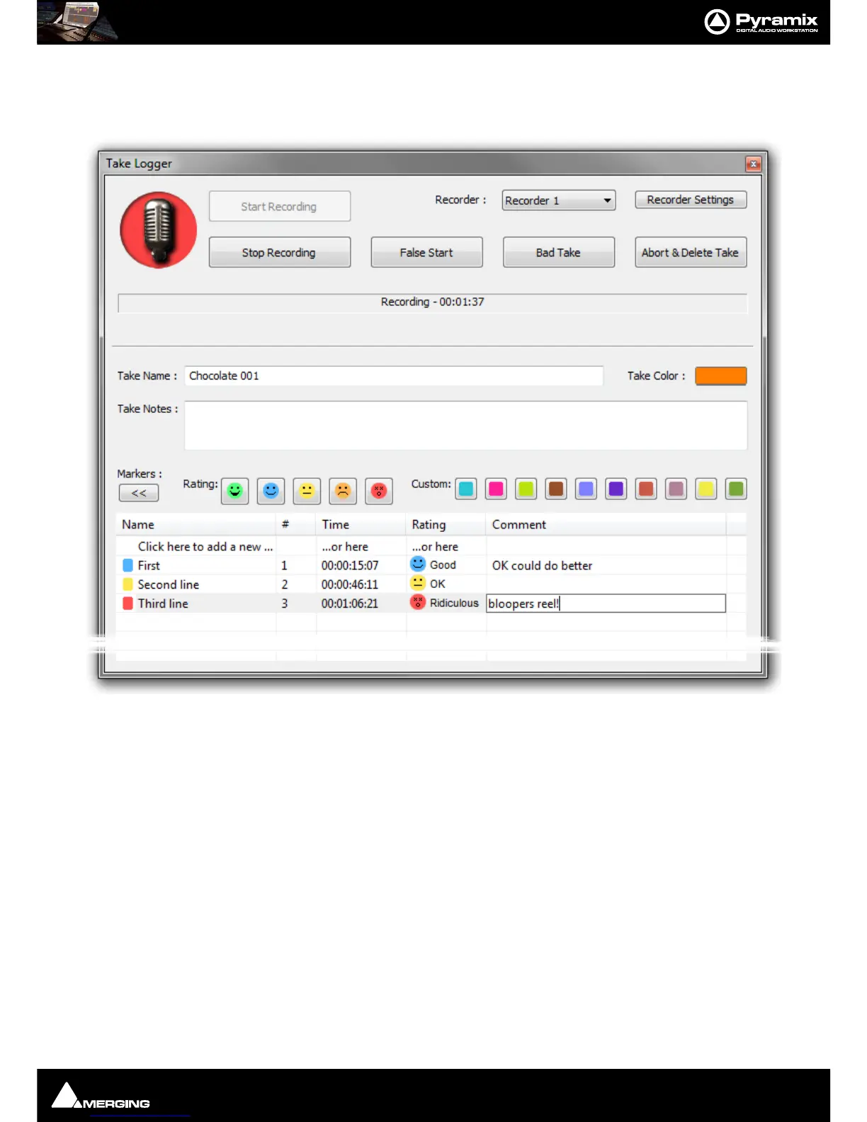 >> Clicking on the [>>] button expands the Take Logger window to show Media Markers added to the recording
