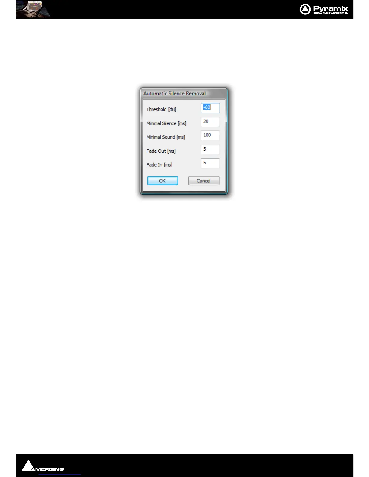 Edit > Automatic Silence Removal Automatic Silence Removal operates by scanning the Selection and then automatically