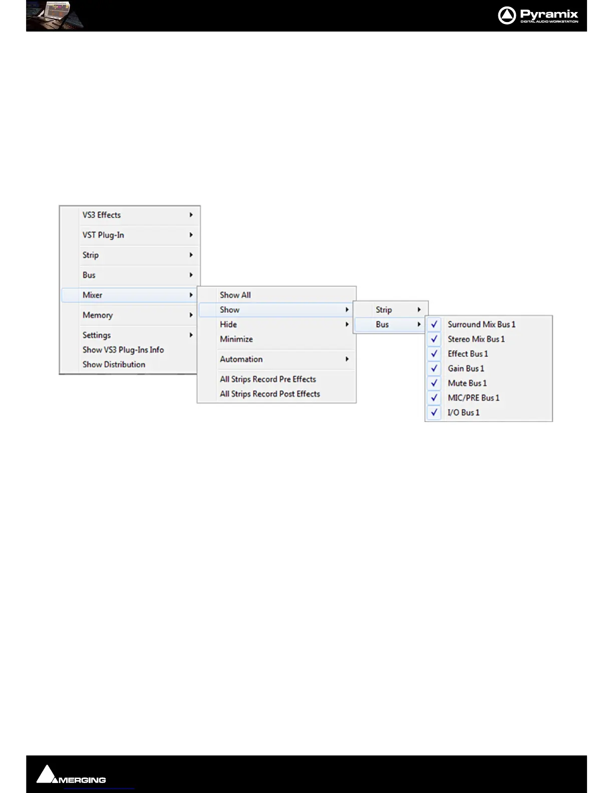 Show / Hide > Selects Strips and Buses to be shown or hidden. When checked, the Buses or