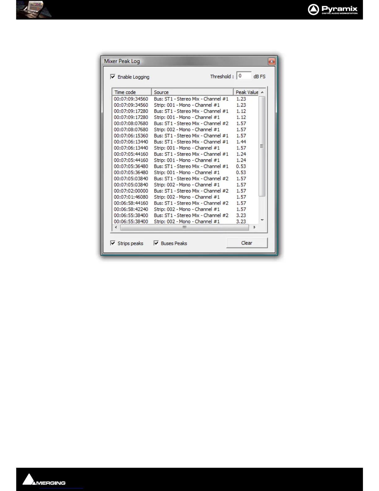 Click on Show Peak Log to open the Mixer Peak Log Window: