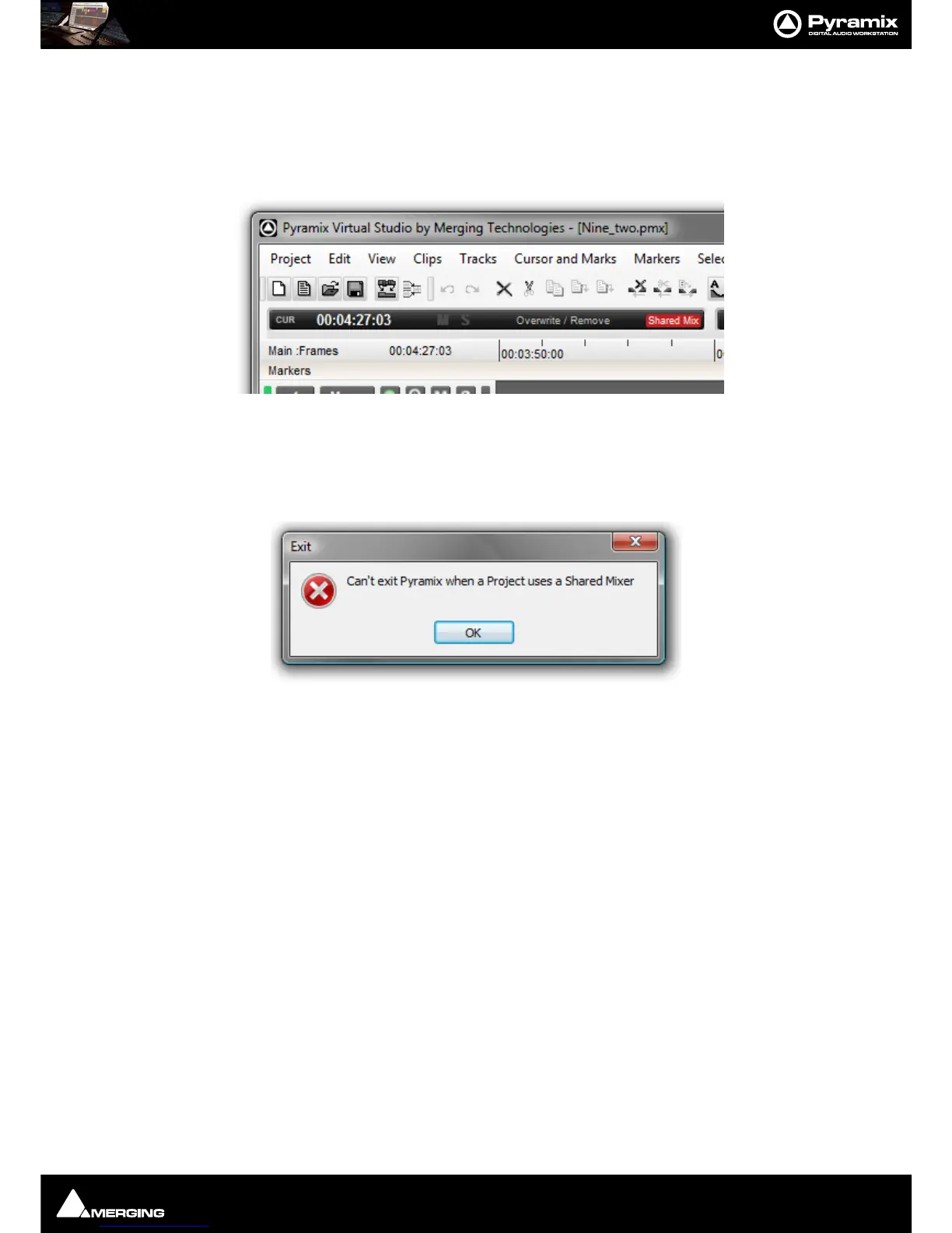 Note: It is not possible to exit Pyramix while a Shared Mixer is active. If you attempt to do so, this