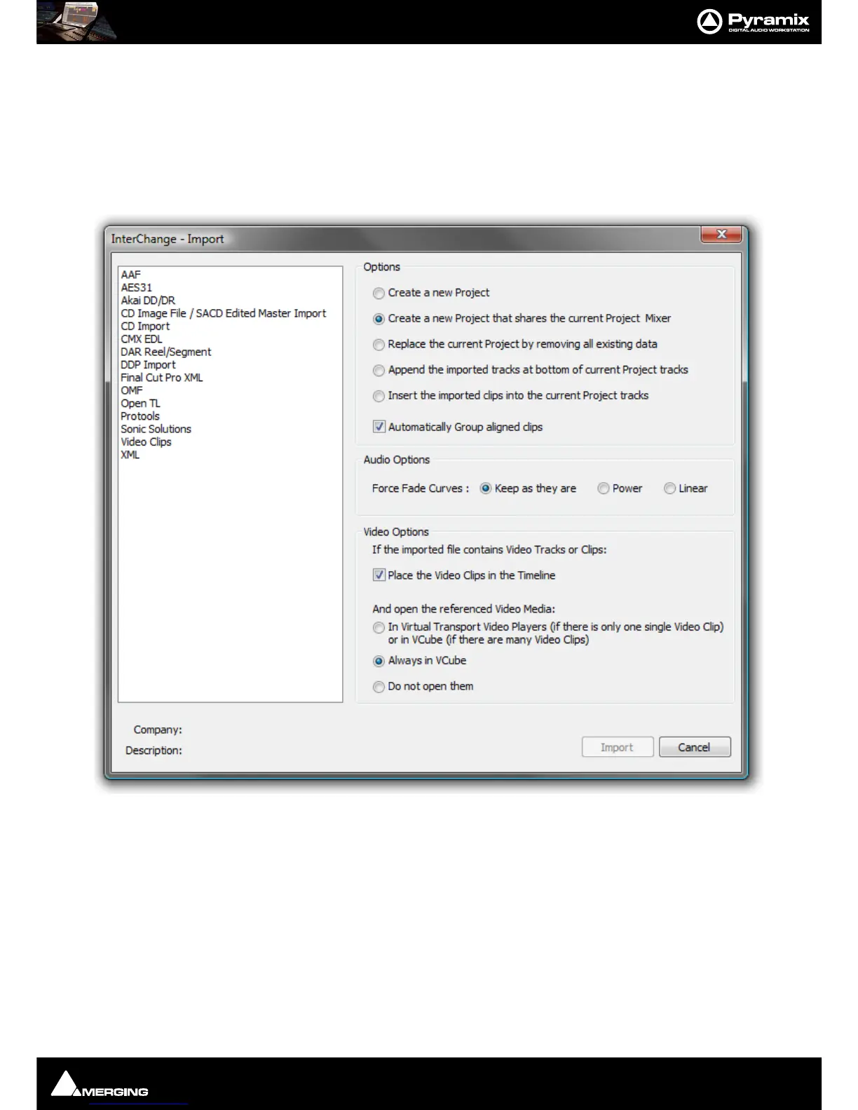 Options radio buttons determine how the imported material will affect the current project.
