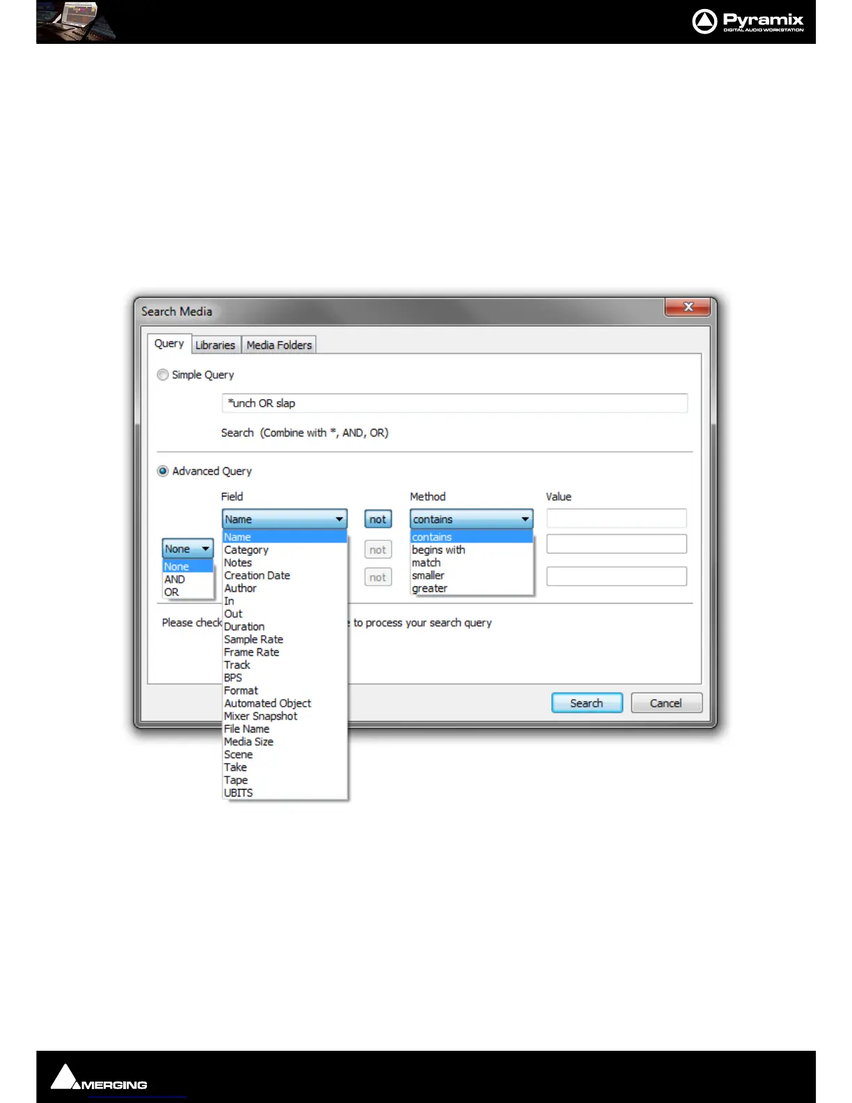 Field Name drop-down list offers the choice of all file types and information