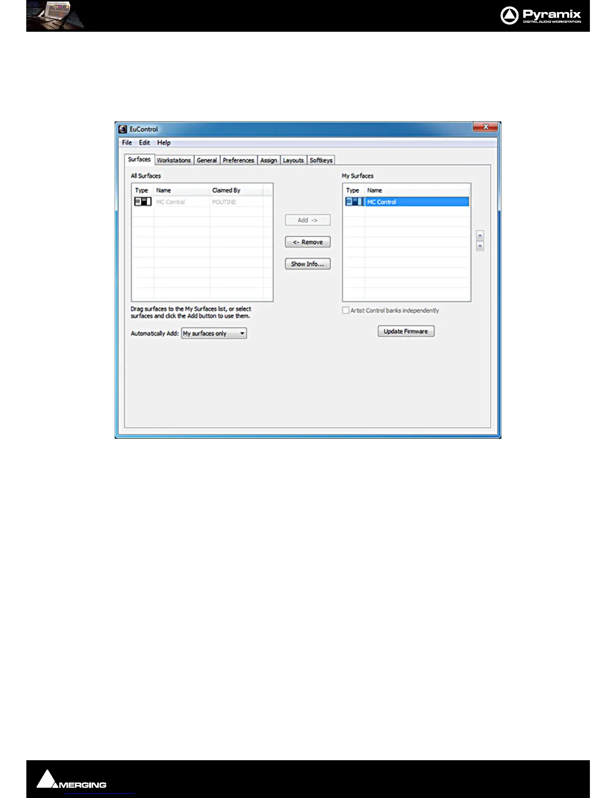 1. Open the EuCon EuControl application and in the Surfaces tab add MC Control Surface to My Surface: