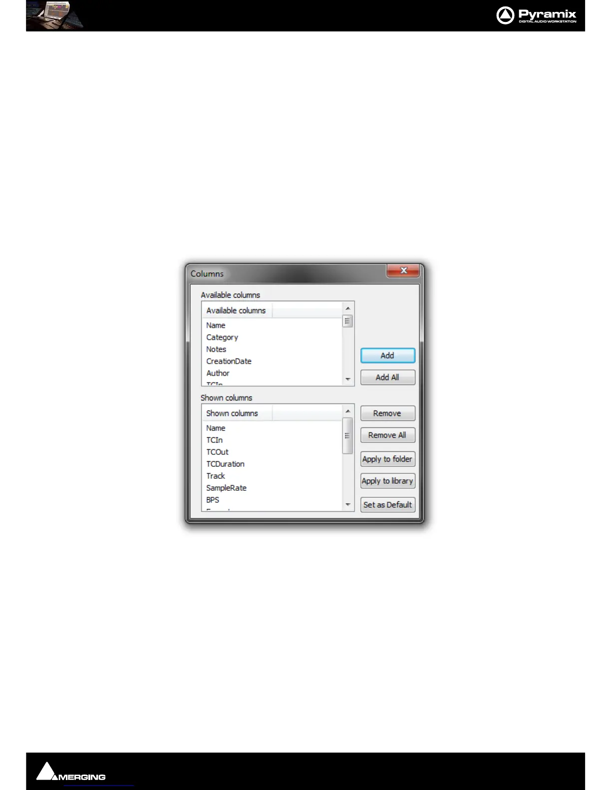 The Columns displayed in Libraries and the Media management window are determined by the Columns dialog