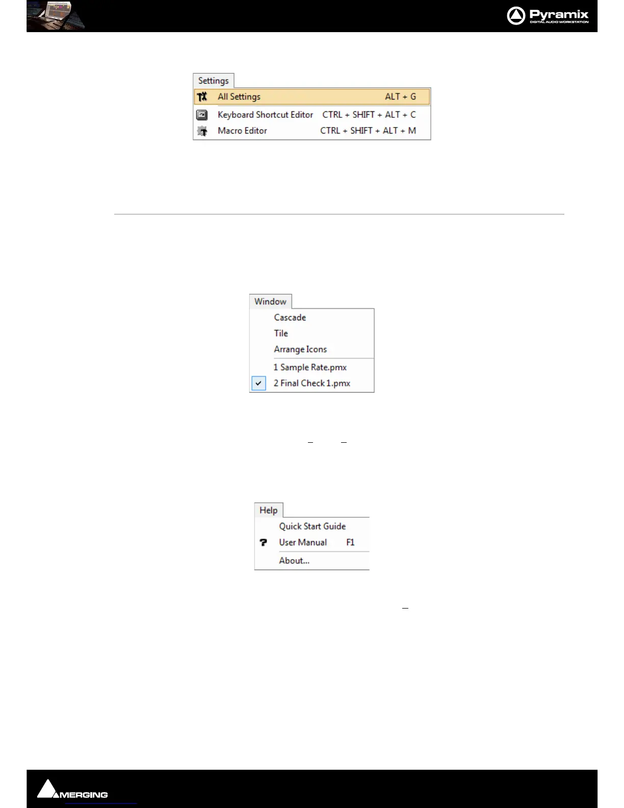 The Help Menu gives quick on-line access to this manual and others. About pops up a Window with the Pyra-