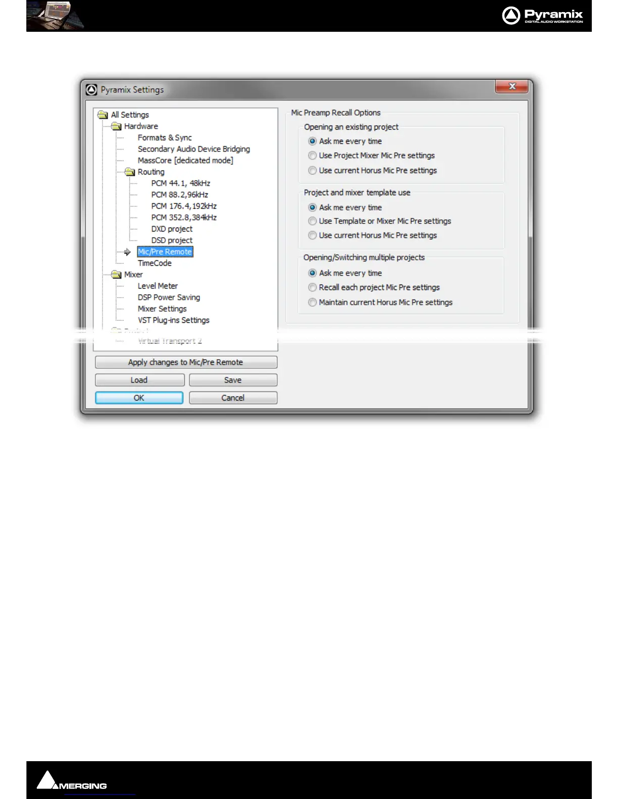 Use Project Mixer Mic Pre Settings When selected the Mic Pre Settings saved with the project replace the cur-